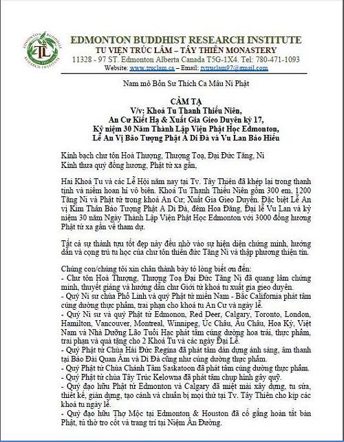 CẢM TẠ - V/v: Khoá Tu Thanh Thiếu Niên, An Cư Kiết Hạ & Xuất Gia Gieo Duyên kỳ 17, Kỷ niệm 30 Năm Thành Lập Viện Phật Học Edmonton, Lễ An Vị Bảo Tượng Phật A Di Đà và Vu Lan Báo Hiếu
