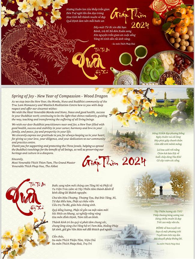 Chúng con kính gửi đến quý Ngài và quý vị thiệp Tết mừng Xuân Giáp Thìn - 2024 với tất cả lòng biết ơn của chúng con. Nguyện quý Ngài và quý vị luôn an lành.